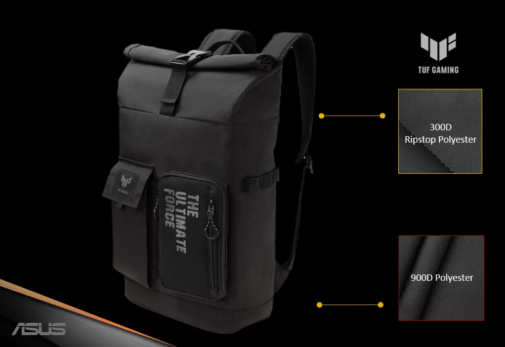 VP4700 sở hữu kiểu dáng cuộn gập (roll-top) linh hoạt, giúp bạn tăng chiều dài balo lên đến 620mm khi cần mang theo nhiều vật dụng. Logo TUF Gaming và dòng chữ “The Ultimate Force” in nổi bật ở mặt trước, khẳng định dấu ấn cá nhân và gu thẩm mỹ của game thủ đích thực.