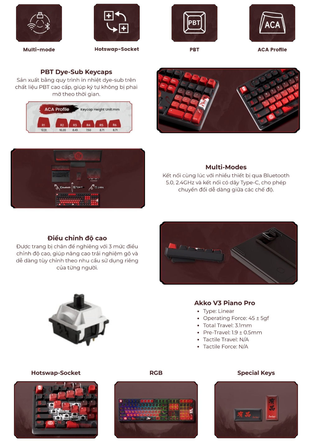 Trang bị Akko V3 Piano Pro Switch, cho cảm giác gõ nhẹ, êm và độ phản hồi chính xác. Đây là dòng switch được tinh chỉnh riêng của Akko, mang lại sự cân bằng giữa tốc độ và cảm giác bấm chân thực, phù hợp cho cả gõ văn bản và chơi game.