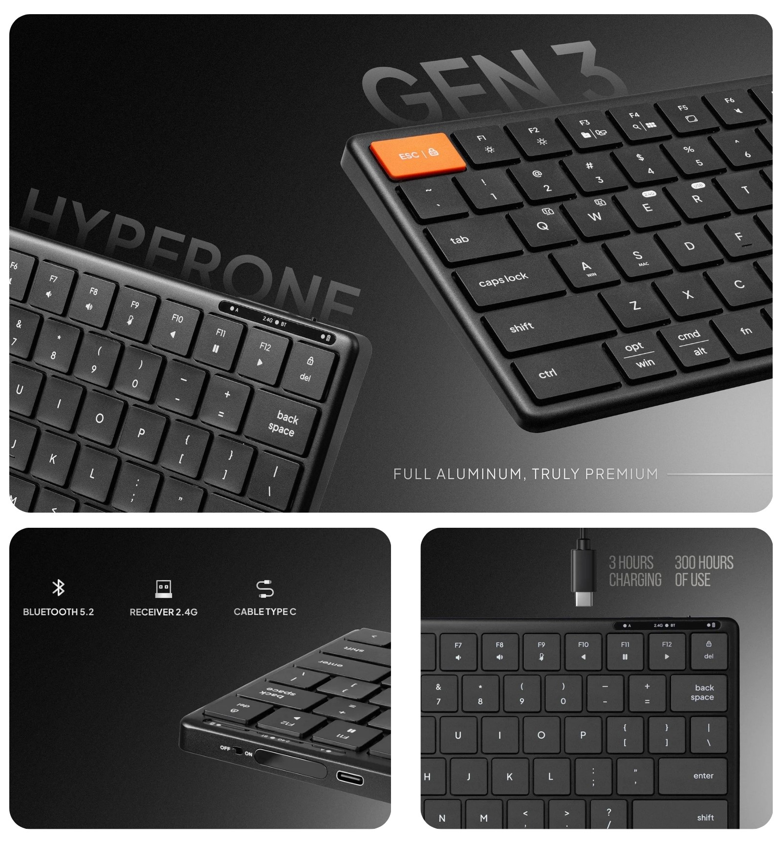 HyperWork HyperOne Gen 3 là chiếc bàn phím công thái học nhỏ gọn, sang trọng với thiết kế full nhôm chắc chắn, mang lại trải nghiệm gõ ổn định, êm ái và bền bỉ. Với khả năng kết nối linh hoạt, thời lượng pin ấn tượng cùng cơ chế gõ tối ưu, đây là lựa chọn lý tưởng cho không gian làm việc hiện đại, cả tại nhà lẫn văn phòng.