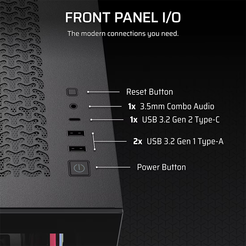 Mặt trước được trang bị đầy đủ USB 3.2 Gen 2 Type-C, 2x USB 3.2 Gen 1 Type-A và jack âm thanh combo, đảm bảo tương thích với các thiết bị ngoại vi mới nhất.