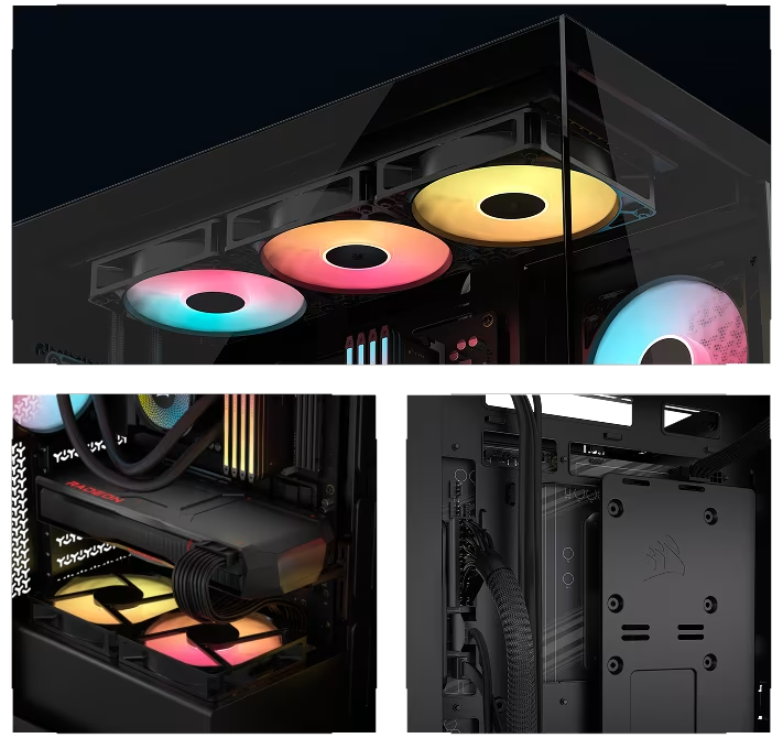 Sản phẩm đi kèm sẵn 3 quạt RS120-R ARGB với thiết kế reverse-rotor, đảm bảo ánh sáng LED luôn rực rỡ và không bị che khuất. Quạt sử dụng công nghệ Magnetic Dome Bearing và AirGuide độc quyền của Corsair, mang lại hiệu suất làm mát vượt trội và tuổi thọ bền bỉ.