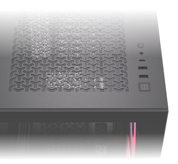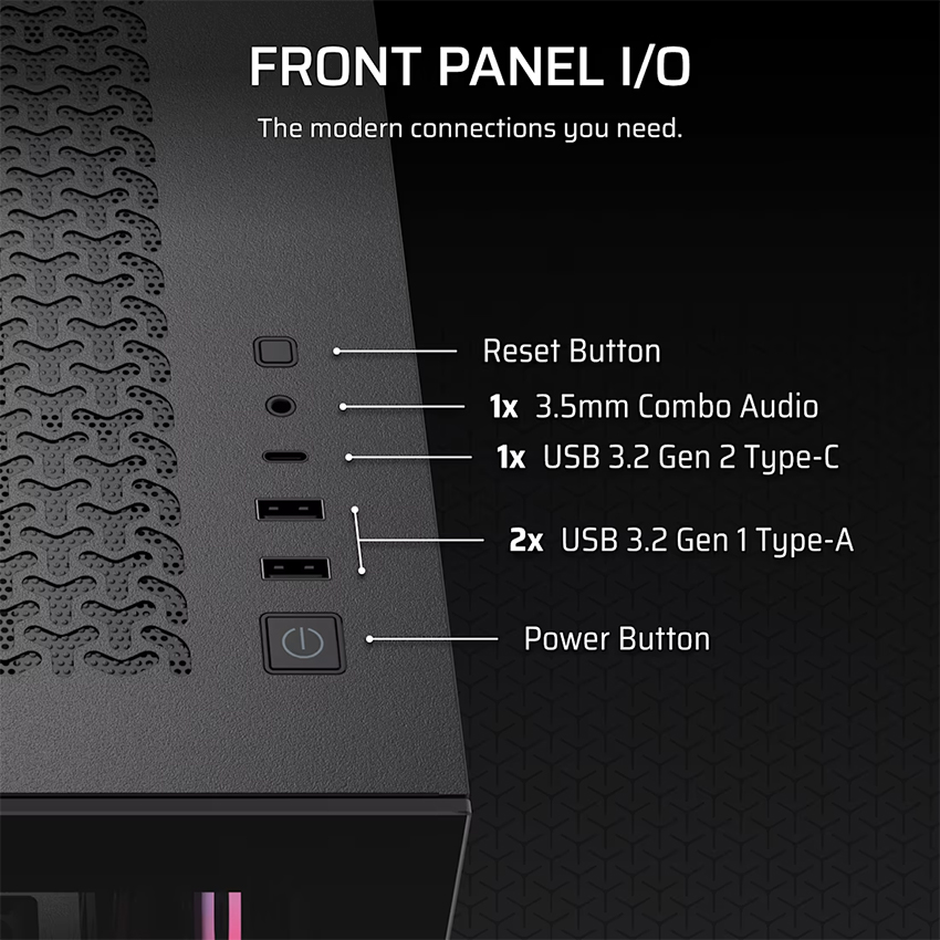 Corsair 3500X được trang bị cổng USB 3.2 Gen 2 Type-C tốc độ cao, 2x USB 3.2 Gen 1 Type-A và jack tai nghe/mic combo ngay mặt trước, giúp bạn dễ dàng truy cập mọi thiết bị ngoại vi.