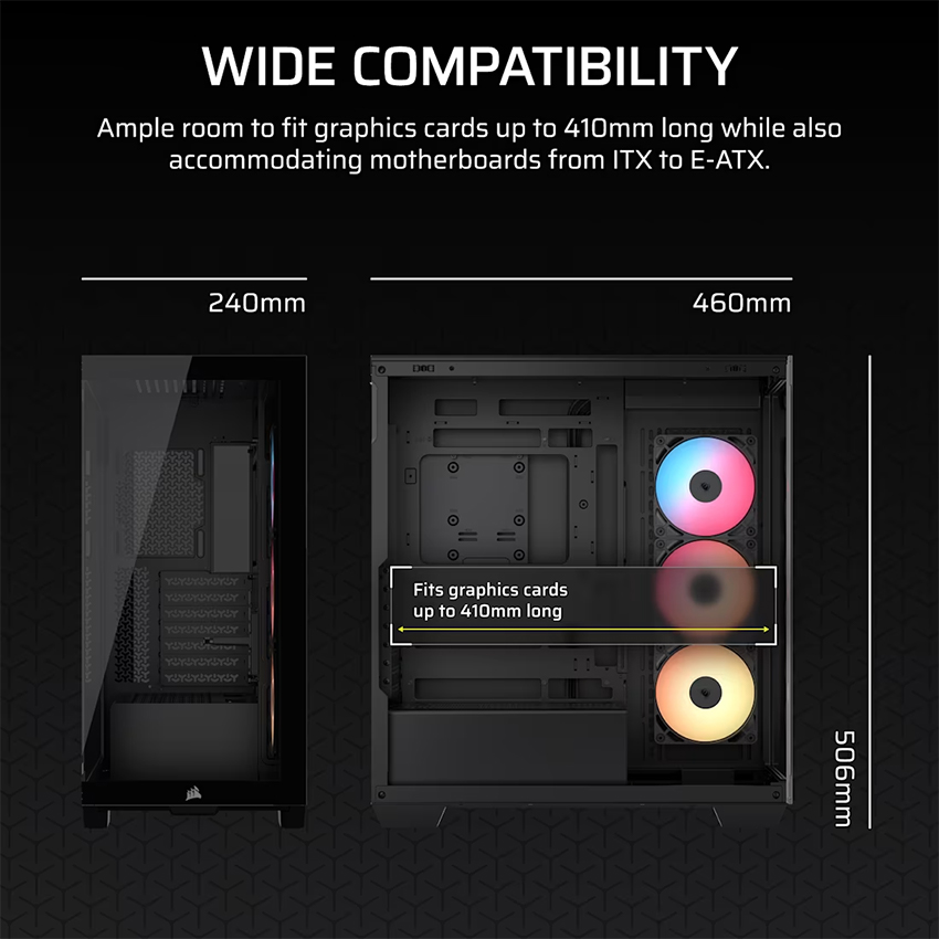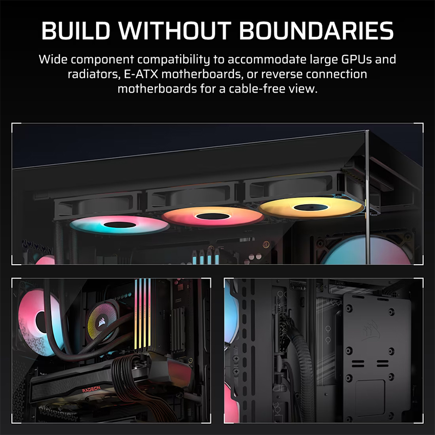 Corsair 3500X RS-R ARGB mang đến phong cách thiết kế wraparound glass view với 2 tấm kính cường lực tháo rời ở mặt trước và bên hông, cho phép bạn phô diễn toàn bộ hệ thống bên trong. Dù thuộc dòng Mid-Tower, 3500X vẫn hỗ trợ card đồ họa dài tới 425mm, tản nhiệt CPU cao 170mm và cả mainboard E-ATX, đảm bảo khả năng lắp đặt mạnh mẽ mà không chiếm quá nhiều diện tích bàn làm việc.