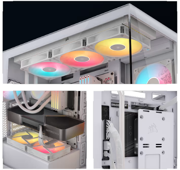 Sản phẩm đi kèm sẵn 3 quạt RS120-R ARGB với thiết kế reverse-rotor, đảm bảo ánh sáng LED luôn rực rỡ và không bị che khuất. Quạt sử dụng công nghệ Magnetic Dome Bearing và AirGuide độc quyền của Corsair, mang lại hiệu suất làm mát vượt trội và tuổi thọ bền bỉ.