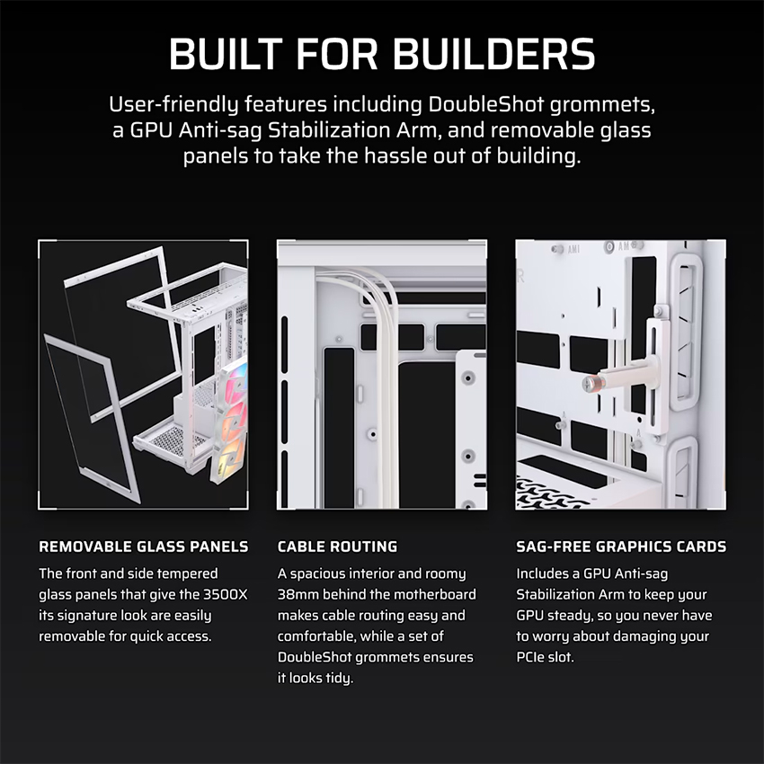- Khoảng trống 45mm phía sau mainboard cùng DoubleShot grommets giúp việc đi dây trở nên đơn giản và thẩm mỹ.