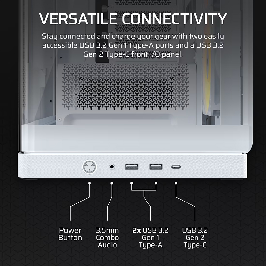 Corsair FRAME 4500X RS-R ARGB sở hữu thiết kế kính cường lực cong liền mạch, kết hợp mặt trước và mặt hông trong một tấm kính duy nhất – tạo nên góc nhìn toàn cảnh ấn tượng, giúp phô diễn toàn bộ linh kiện bên trong PC mà không bị che khuất bởi khung hoặc góc cạnh.