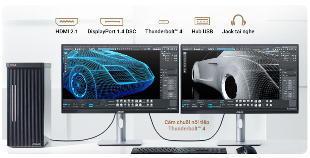 ProArt PA32QCV được trang bị 2 cổng Thunderbolt™ 4 hỗ trợ truyền dữ liệu tốc độ cao, kết nối chuỗi Daisy Chain, và sạc Power Delivery lên đến 96W – giúp bạn dễ dàng kết nối MacBook, laptop hoặc thiết bị ngoại vi chỉ qua một dây cáp duy nhất.