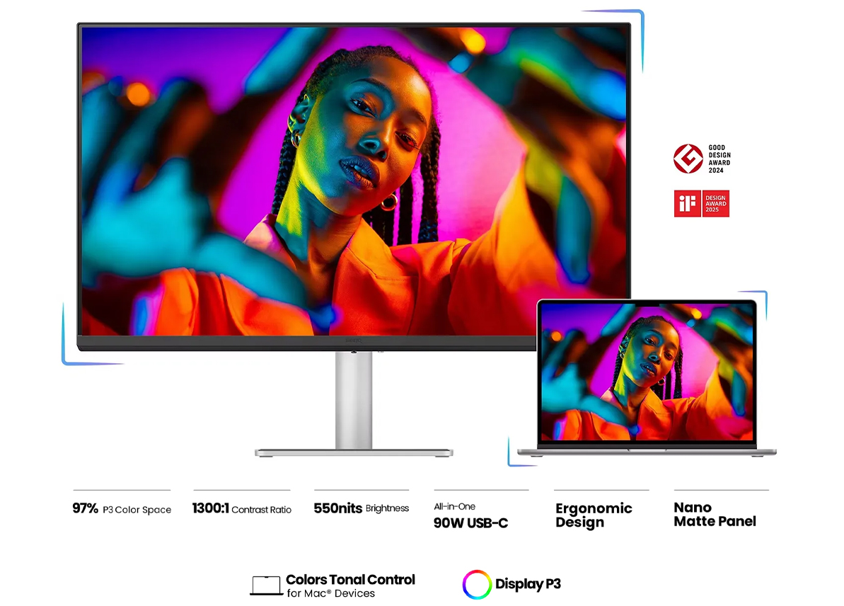 BenQ MA320U được thiết kế đặc biệt cho người dùng MacBook Pro và MacBook Air, mang đến khả năng hiển thị màu sắc chuẩn Mac với gam màu rộng 97% DCI-P3 và 99% sRGB. Nhờ được hiệu chỉnh màu chính xác ngay từ nhà máy và hỗ trợ ICCsync, màn hình đồng bộ hoàn hảo với màu hiển thị trên MacBook, đảm bảo hình ảnh luôn trung thực, nhất quán và sắc nét đến từng chi tiết.