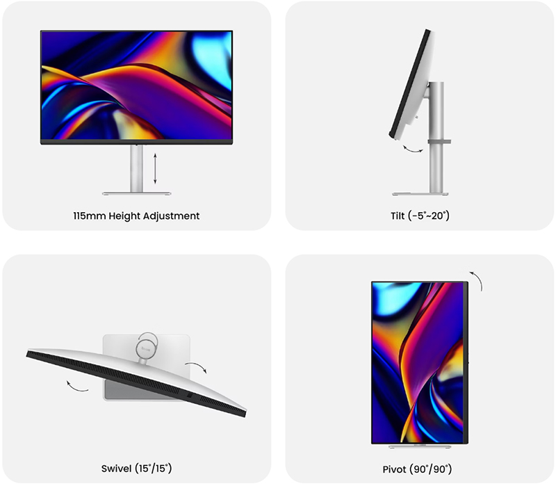 BenQ MA320U sở hữu thiết kế tối giản, thanh lịch với viền mỏng và chân đế kim loại chắc chắn, phù hợp với phong cách làm việc hiện đại của người dùng Mac. Màn hình hỗ trợ nghiêng -5° đến 20°, xoay trái/phải 15°, xoay dọc 90° và điều chỉnh độ cao 115 mm, mang lại tư thế xem thoải mái và linh hoạt trong mọi tình huống.