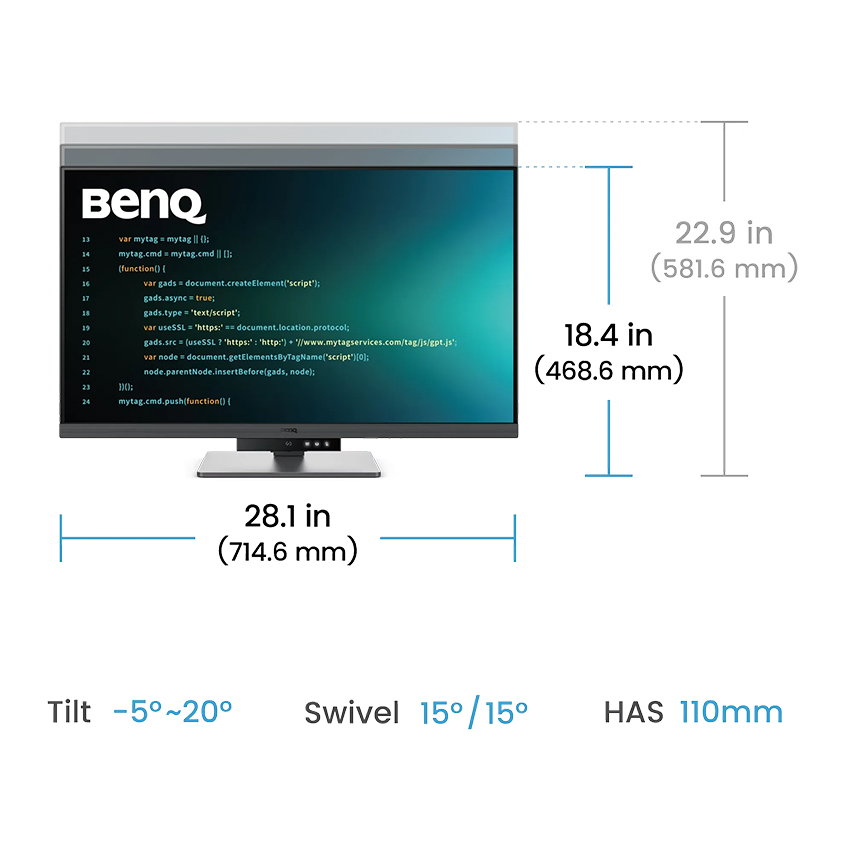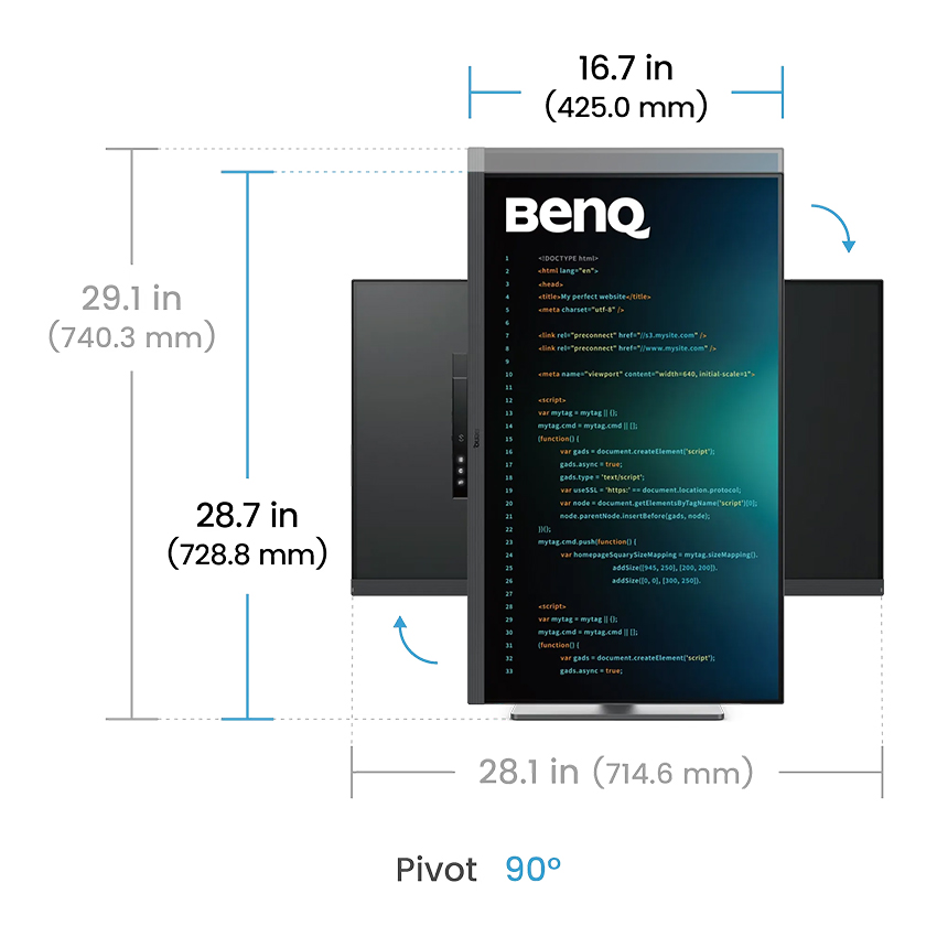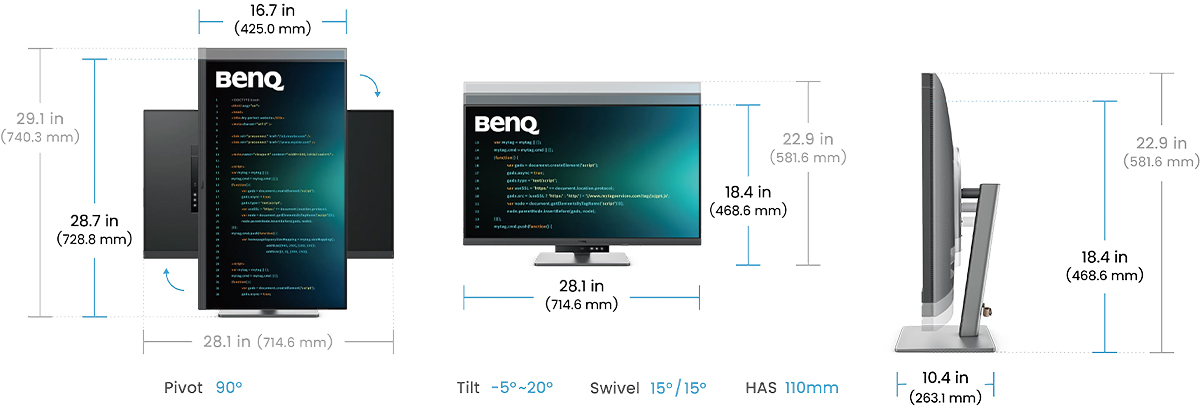Màn hình BenQ RD320U hỗ trợ điều chỉnh độ cao, xoay, nghiêng và trục dọc (pivot), giúp người dùng tìm được tư thế làm việc thoải mái nhất.
