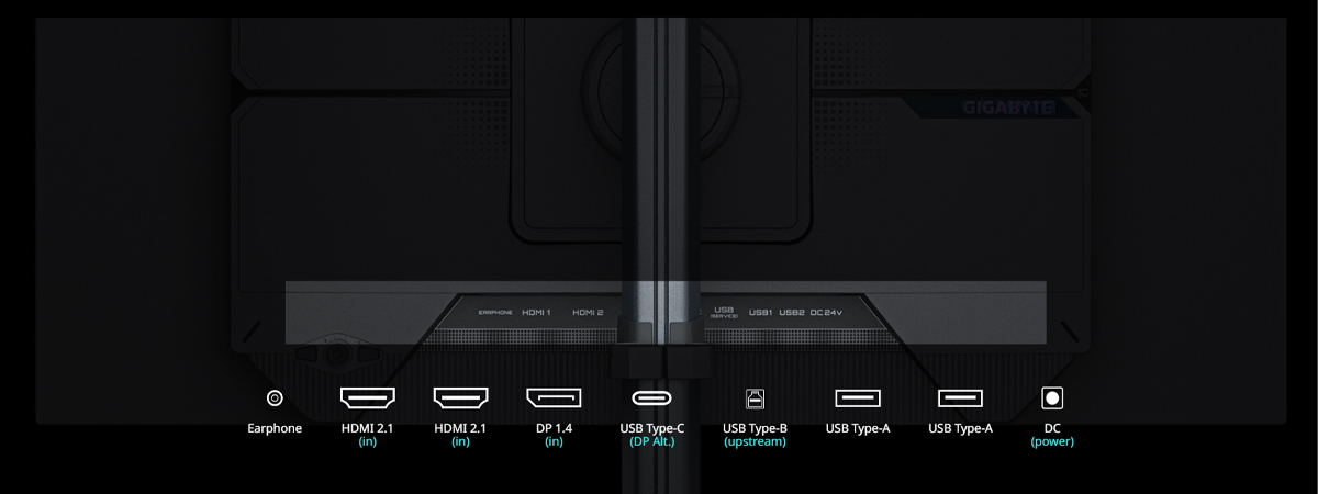 | Cổng kết nối | 2× HDMI 2.1, 1× DisplayPort 1.4, 1× USB-C (PD 18W), 2× USB 3.2 Downstream, 1× USB 3.2 Upstream, 1× Jack tai nghe |